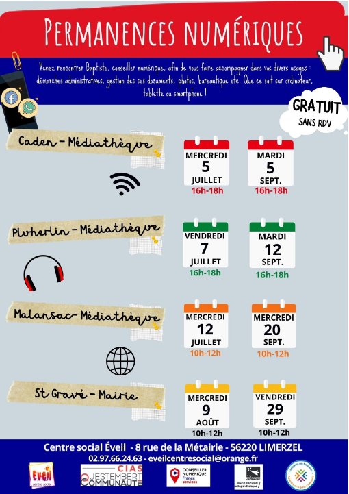 Plusieurs permanences numériques sont organisées à la Médiathèque de Malansac. Venez rencontrer Baptiste, conseiller numérique, afin de vous faire accompagner dans vos divers usages : démarches administratives, gestion de ses documents, photos, bureautique… Alors à vos ordinateurs, tablettes ou smartphones !