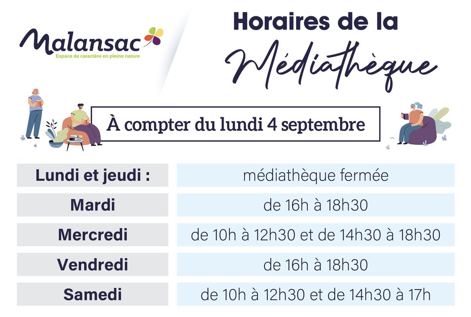 A partir de lundi prochain, retrouvez votre médiathèque aux horaires suivants :