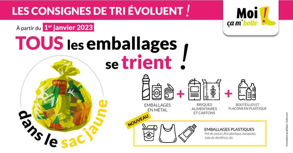 NOUVEAU à partir du 1er janvier 2023, TOUS les emballages se trient ! Dans les sacs jaunes, vous jetez déjà les emballages en métal, les briques alimentaires et cartons, les bouteilles et flacons en plastique. Vous pourrez désormais y déposer tous les autres emballages en plastique (pots de yaourt, film plastique, barquette, tube de dentifrice, etc.) ! Plus d’infos : https://qc.bzh/extension-consignes-tri